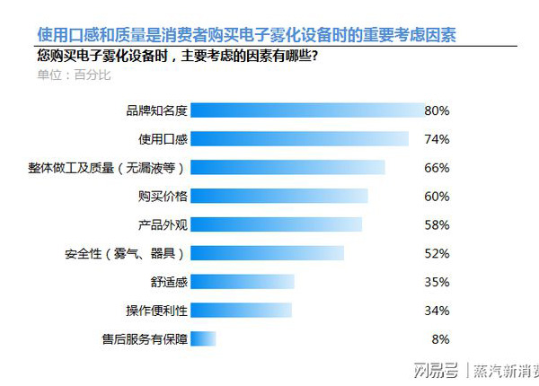 据调查,在影响消费者购买电子雾化设备的考虑因素中,品牌知名度、使用口感、整体做工及质量这三大因素是消费者购买的三大主要因素。其中,使用口感占比达74%,只比品牌知名度少6%。这进一步表明,使用口感,正在成为消费者对电子雾化产品购买的的最重要因素。