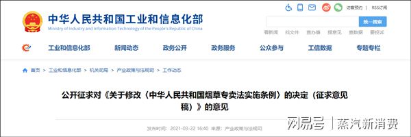 3月22日消息,工业和信息化部、国家烟草专卖局研究起草了《关于修改〈中华人民共和国烟草专卖法实施条例〉的决定(征求意见稿)》。