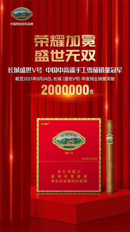 截至2021年8月24日,长城(盛世Ⅴ号)年度商业销量突破200万支。