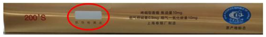 中华(双中支)产品条盒侧面有电子变轨防伪涂层:条盒侧面防伪检测点白色区域刮擦后呈现蓝色,一段时间后蓝色褪去。