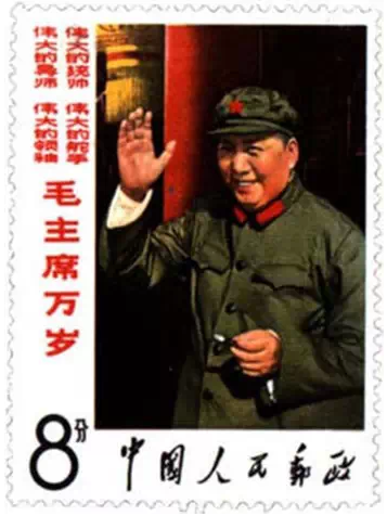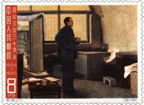 1965年1月31日,邮电部发行的纪109《遵义会议三十周年》邮票,全套3枚,其中第一枚是“决战前夕”,图案是身穿灰蓝色大棉衣,右手叉腰,左手拿着香烟的毛泽东同志,他面对窑洞墙壁上的军事地图,聚精会神地思索着,真实、自然、恰如其分地展现了革命领袖胸中自有雄兵百万、运筹于帷幄之中的博大胸怀。1967年9月,邮电部发行的文2第六枚“毛主席在挥手”邮票,图案是毛主席站在天安门广场向红卫兵和学校师生游行队伍致意。