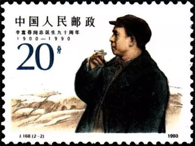 1990年5月22日,邮电部发行J168《李富春同志诞生九十周年》纪念邮票,全套2枚,其中第二枚是“战争年代”,这枚邮票是作者刘向平根据李富春同志在陕北时的照片而设计的。主图是李富春同志身穿军大衣,吸着香烟,并用淡淡的山丘和窑洞作背景,来展示李富春为中国革命事业在操劳。李富春同志吸烟的动作是精心安排的,这个姿态揭示出李富春同志工作不息的精神。