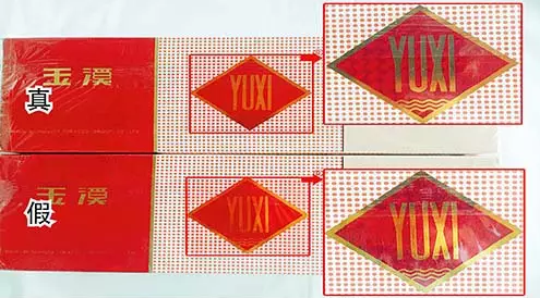 真烟包装“YUXI”字母立体感强,假烟包装“YUXI”字母笔画细且无立体感。