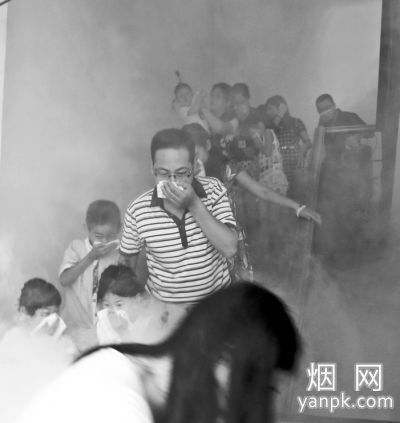 读者们模拟演练如何在起火后迅速从烟气中逃生