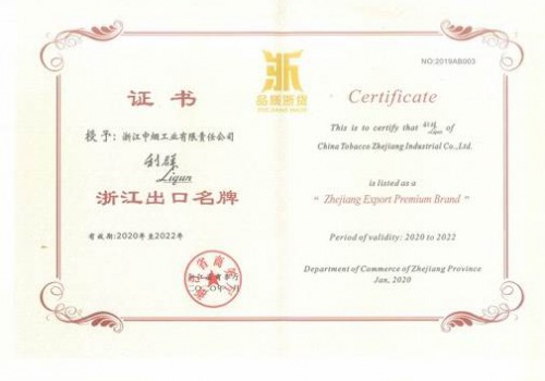 浙江中烟“利群”被授予“浙江出口名牌”荣誉称号