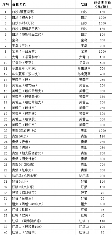 三亚市烟草专卖局(公司)2020年在销规格目录