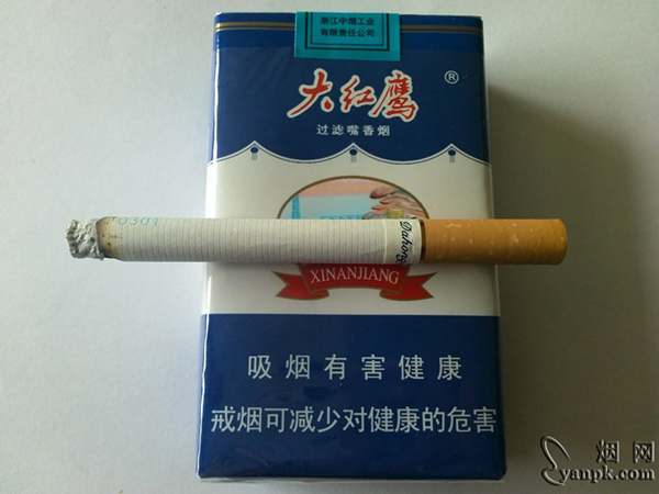背面与主版面相差无几,区别甚微,只是大红鹰的主品名被Dahongying所取代。左侧为商品条码:6901028120272,这跟之前新安江软蓝6901028117845的条码是不一样的,顶端终于看见了那只熟悉的老鹰LOGO,只是这只老鹰已是瘦骨嶙峋,再也飞不起来了。右侧是详细的产品信息,焦油量:8mg 烟气烟碱量:0.8mg 烟气一氧化碳量:8mg,已属低焦产品,不过三项指标比例均衡,这在低档产品中还是不多见的。顶部浅蓝色的封签上有浙江中烟的标志,一个“烟”字形抽象的三潭印月。底部:“大红鹰”三个字再一次出现。