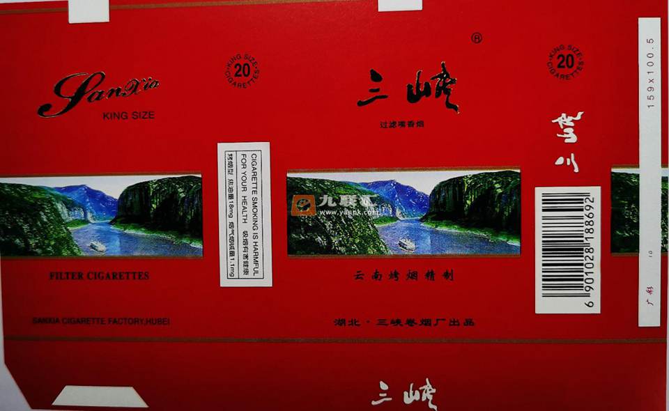 “三峡”烟标为湖北三峡卷烟厂出品,生产年代不详。该烟标主版图案是三峡景观,只见两岸高峰夹峙,长江水面狭窄曲折,水流急湍,险峻幽深,壮观雄奇。副版图案和主版图案一致。