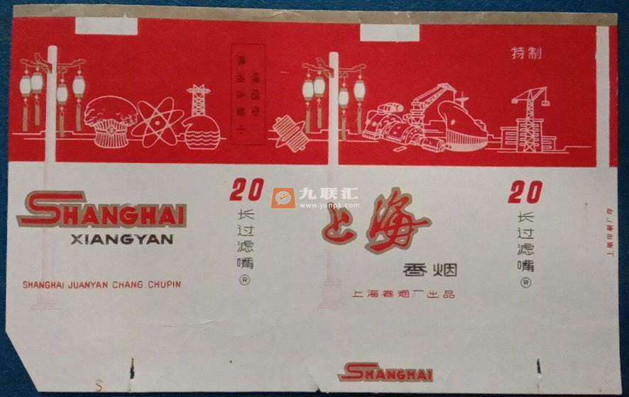 中国上海卷烟厂曾出品“上海”牌香烟,特制,20支装,长过滤嘴,烤烟型,焦油含量中。该烟标上的“上海”二字,潇洒生动,灵活自如,属行草字体,非常漂亮,引人入胜,美感十足。该烟标上的图案有高楼、塔吊、轮船、华灯等,简洁明快,从一个侧面充分展示了上海经济的繁荣发达和独特历史文化魅力,令人震撼,令人神往。