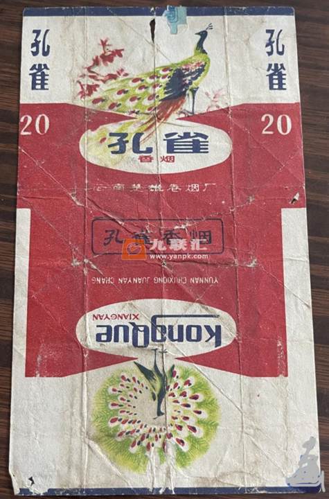 中国云南楚雄卷烟厂曾出品“孔雀”牌香烟,20支装。该烟标上的“孔雀”二字,属楷书字体,严谨大方,遒劲有力,气韵生动,美不胜收。该烟标上的孔雀图案,漂亮华贵,栩栩如生,充分展示了孔雀的美丽动人形象和无穷神奇魅力,令人惊叹,令人陶醉,令人难忘。