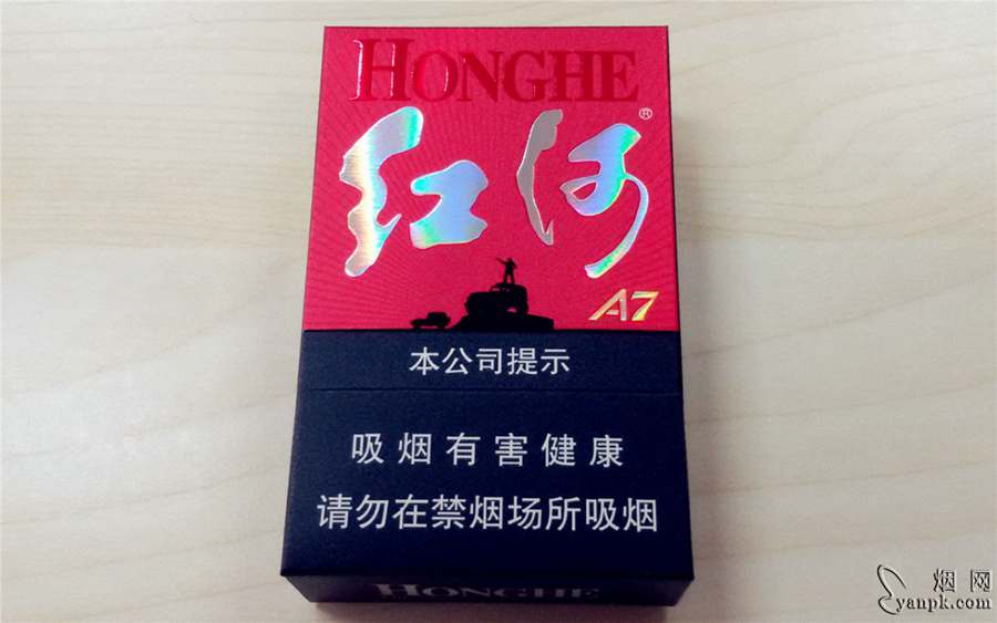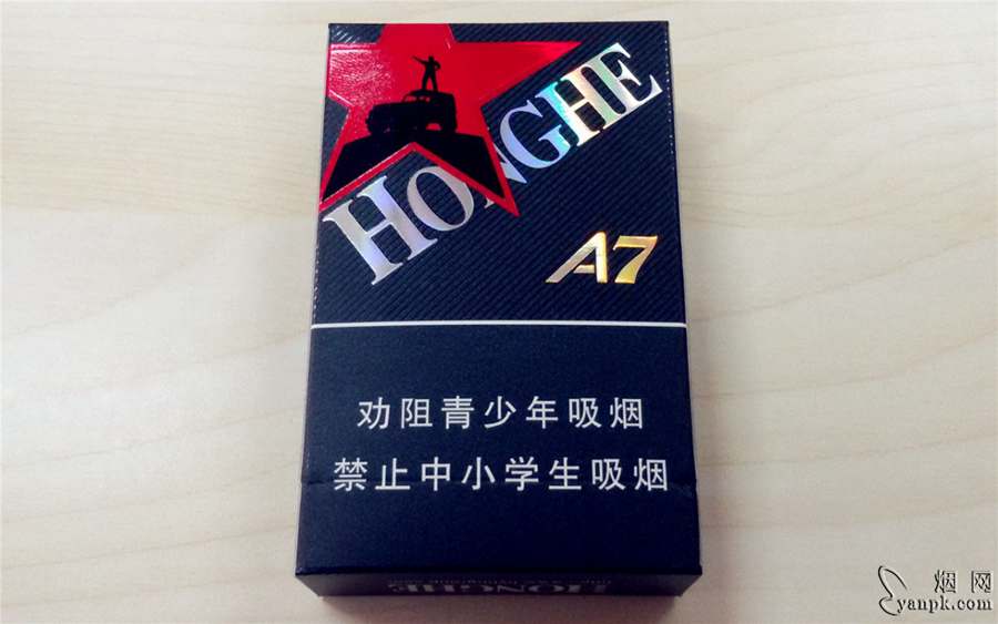 烟盒正面外观延续了V8的红黑色调,不同的是V8是行云流水、平顺连贯的渐变过渡,类似于无极变速;而A7的红与黑泾渭分明、换挡突变,粗暴而不粗鲁。“红河”二字被放大到前所未有,金色的A7规格名也甚为醒目——这一点必须要给赞啊!国内现在很多烟,带有炫技性质地挖空心思,给新产品起了个看似高大上、实则不明觉厉拗口饶舌的名字,然后又偏偏不把它印到烟盒上!我勒个擦,烟民拿到这包烟该怎么叫它?连名字都叫不上来,又怎么去购买和传播?你以为所有烟民都会上烟悦、都会关注公众号、都会扫二维码、都会主动去查这包烟的真名?你以为你以为的就是你以为的?简直是脑髓里有贵恙啊!再说回今天这包烟,无论田夫野老、农妇村氓,只要一看烟盒,就能准确叫出“红河A7”来,大大降低买烟和卖烟的沟通成本,进而助力其传播,很好。烟盒红与黑的交界处,可见一人站于车顶,一手叉腰一手高举的剪影,在红色块光芒四射的底纹映衬下,虽小,亦夺目。背面这幅剪影被略微放大并置于红色五角星里,构图也不错,但个人对五角星的两个角弯折90度延入侧面和顶部的设计就不太喜欢了,看上去略微有点怪。另,除正面外,其余五面均为黑底斜纹,颇有质感。