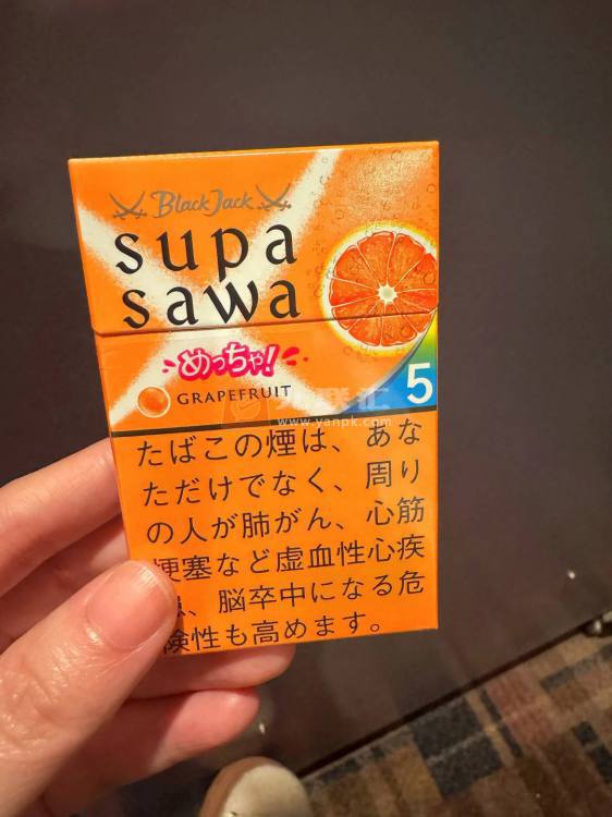 黑杰克supasawa西柚味,5毫克焦油0.4烟碱,但是抽起来不像5mg,因为很顺很柔,感觉有点像3毫克焦油(我瞎说的)。 开盖是很香的鸡尾酒味,一段时间后变淡,成了凉茶味,甜杆,爆珠味不重,就像普通的薄荷烟,但是口感是我抽过的supasawa这几包里最好抽的。