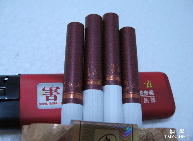 底部开包,烟支在盒内呈7-6-7形式排列,烟丝褐黄油润,切口比较整齐。烟嘴水松纸呈紫红色,与烟盒包装色彩统一协调,其上有花纹图饰作为底蕴,视觉上比较时尚,金色的牡丹花卉和“长白山”的品牌名称标注其上,非常雅致。烟嘴的包装比较长,显着烟支的烟丝部分较短,有点不太实在。