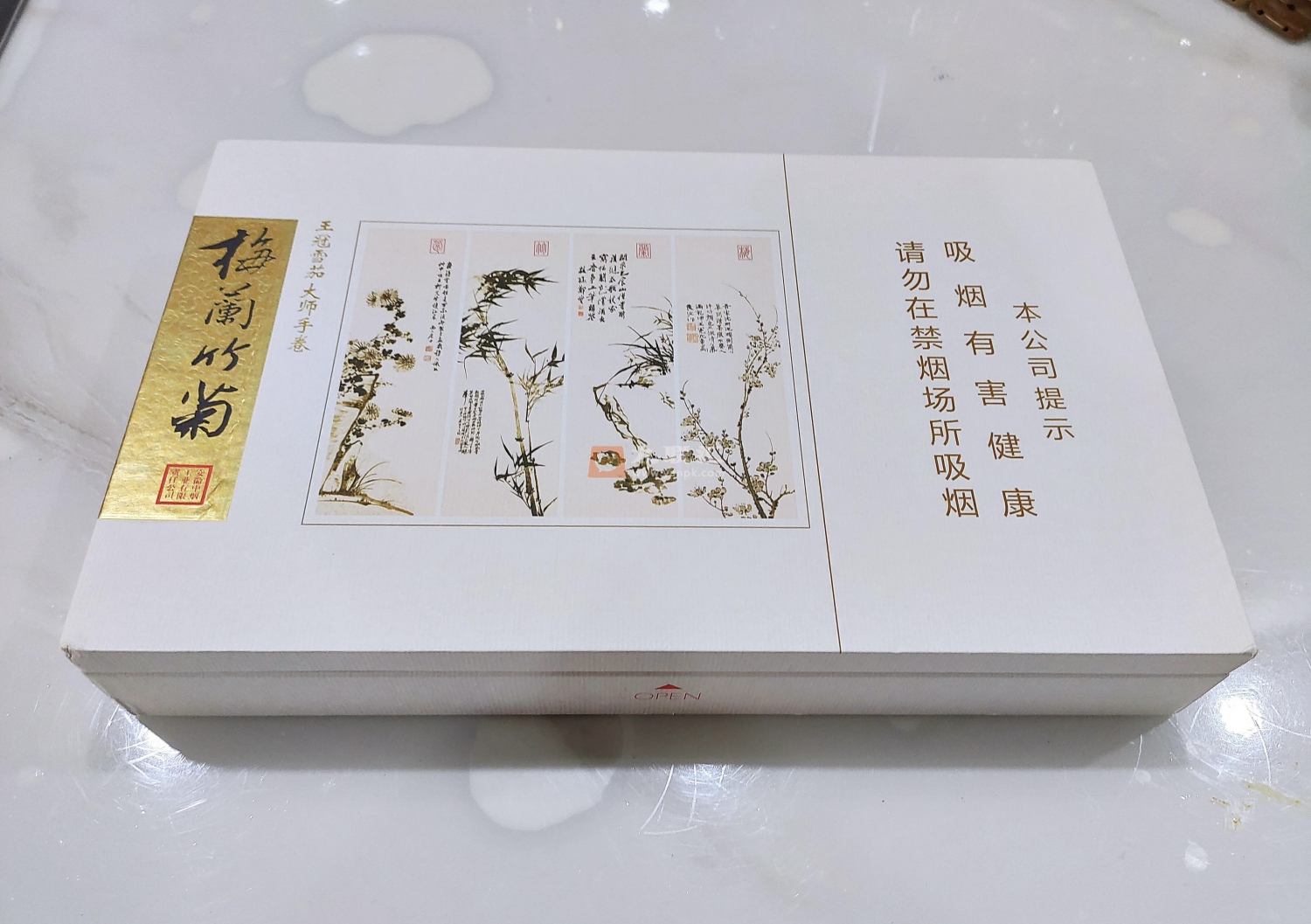 王冠梅兰竹菊雪茄,平时都是到手灰,这包装如同艺术品一般精致,以至于无法下手,放柜子里调整个把月再灰吧。
